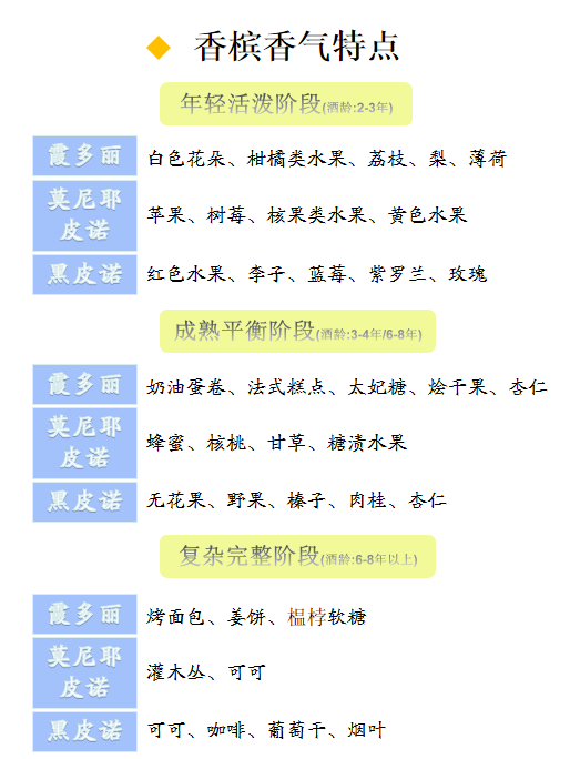 • 酿造香槟的品种不同,陈年时间不同,香槟的香气特点也不一样。